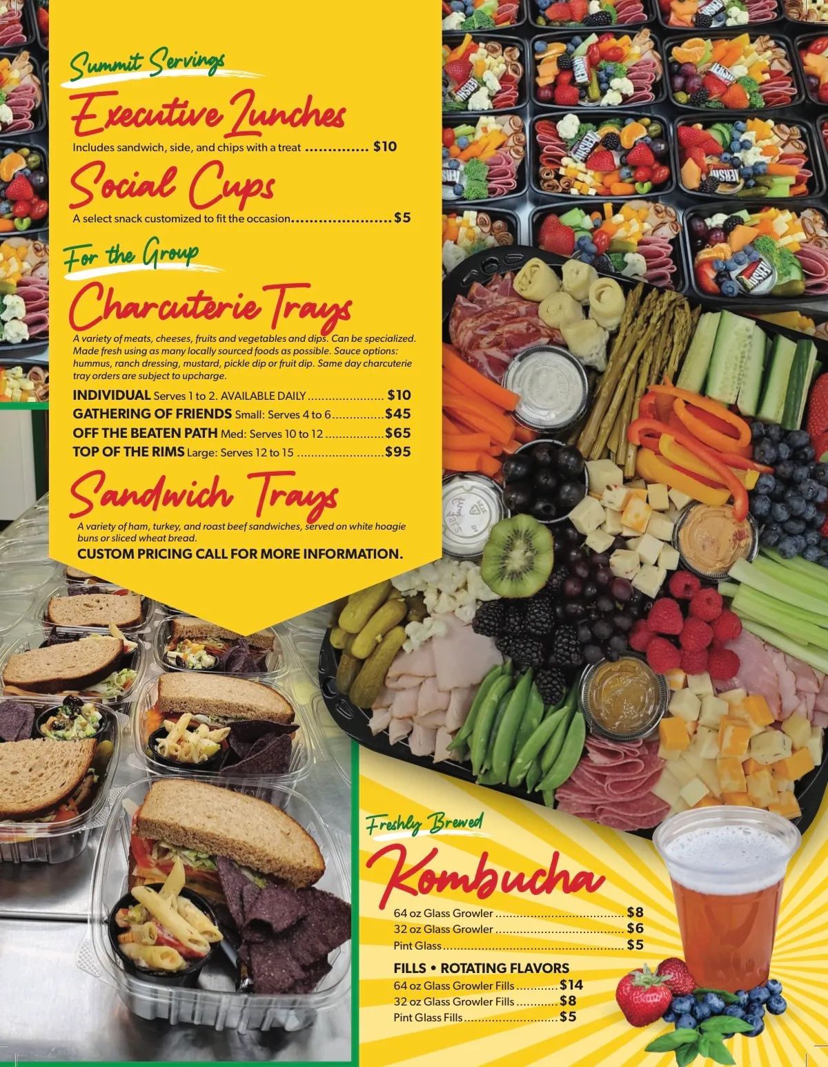 We also offer charcuterie trays filled with the same meats and cheeses and add a fun variety of fruits and vegetables, sure to keep you excited about lunch. We also offer curry chicken, oven roasted chicken, and egg salad sandwiches or sides and we make pasta salads and offer a special almost every day. We also offer delicious, hearty, homemade soups every day.